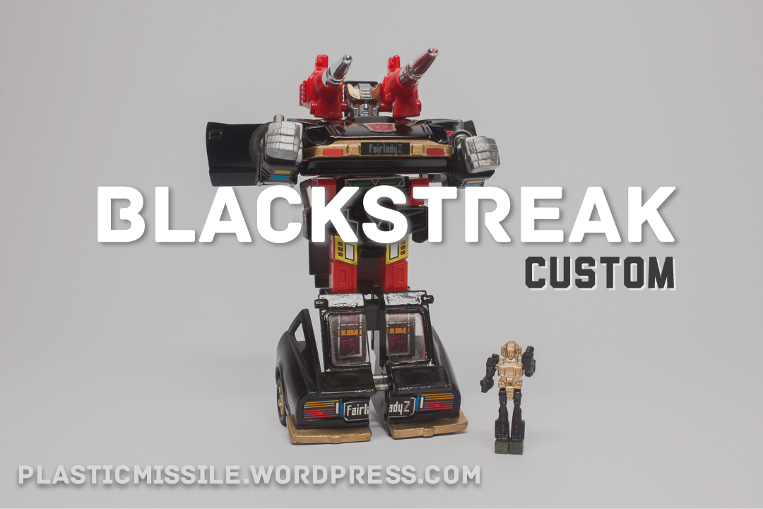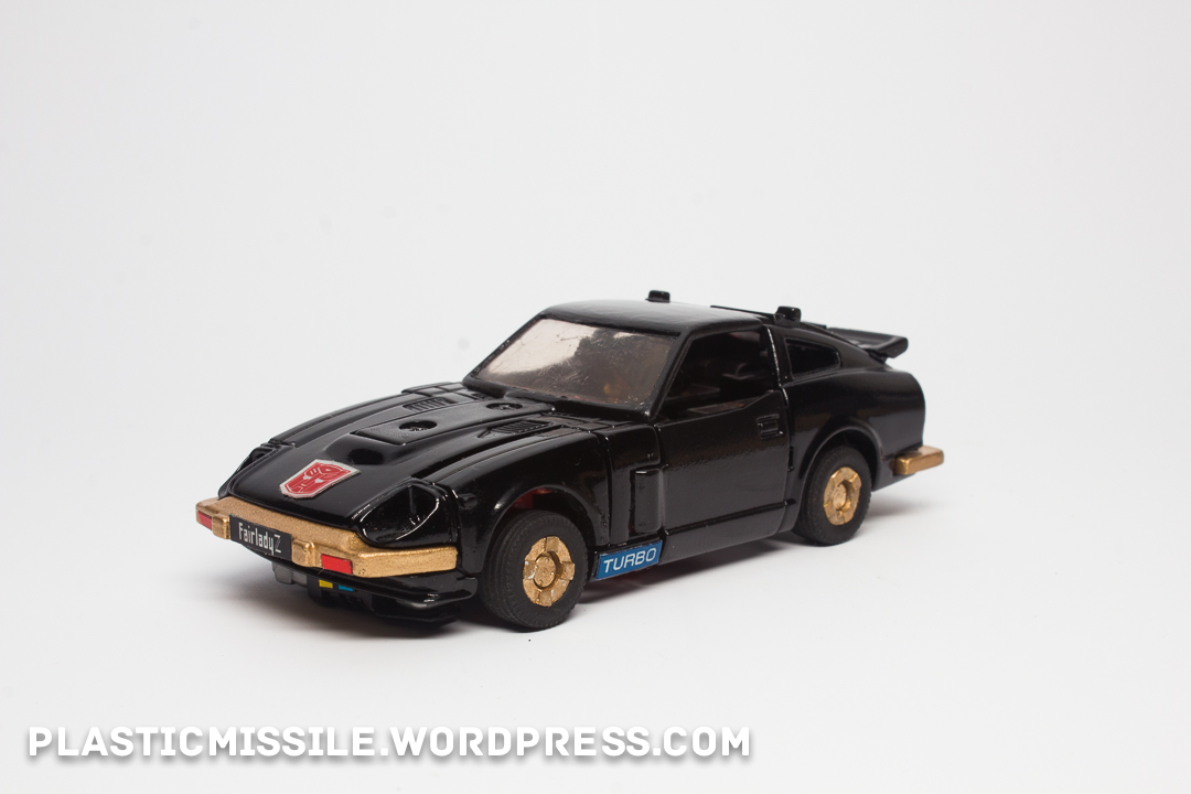 This is a really old kitbash project I started working on over 15 years ago. This particular Bluestreak was my old childhood toy, one of the first Transformers I ever owned – a Diaclone mold stamped Takara Japan with no dates, from Hasbro’s first wave in 1984. The poor thing was in typical horrible shape – broken roof, broken rear windows, missing car door, missing wheel, and really dinged up overall. Over the years, I slowly picked up the missing pieces one by one, and experimented with different spray lacquers since I had painted the pieces at different times. Here is the final result for his alt mode – a jet black Nissan Fairlady Z (Datsun 280ZX) with custom spoilers, and retro-fabulous gold “plated” rims and fenders.