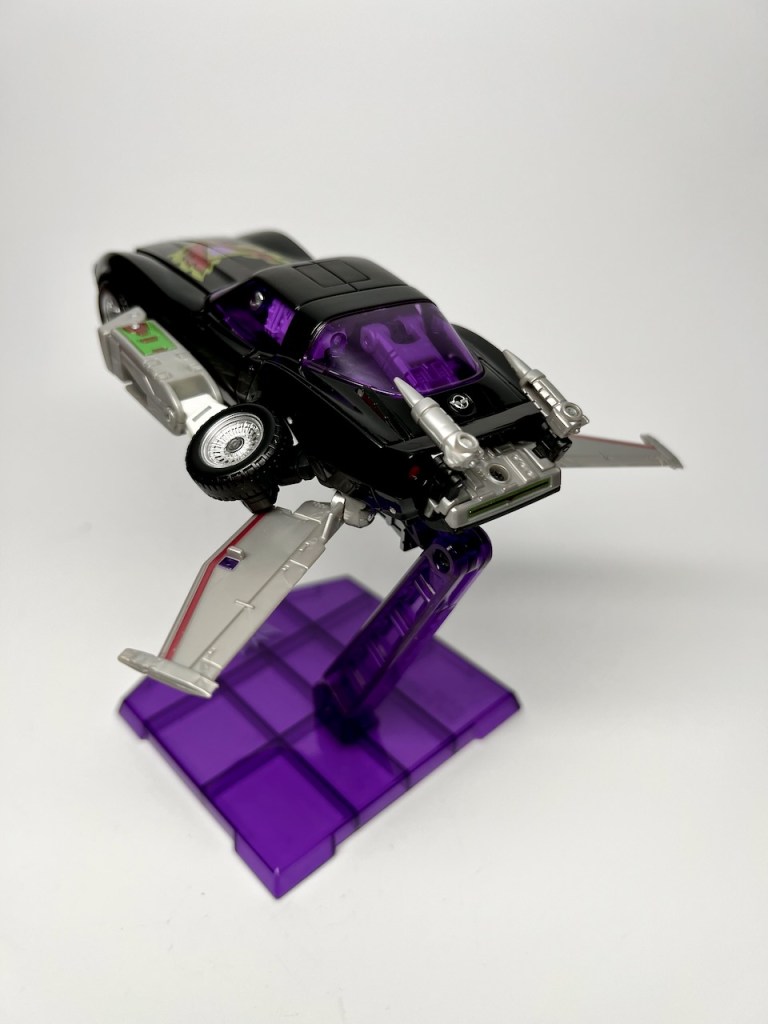 I really like the Decepticon stand, although my peg is broken off. I usually display all my bots in bot mode, but that translucent Decepti-purple is just so retro-futuristic, it adds some pizazz when in flying car mode.