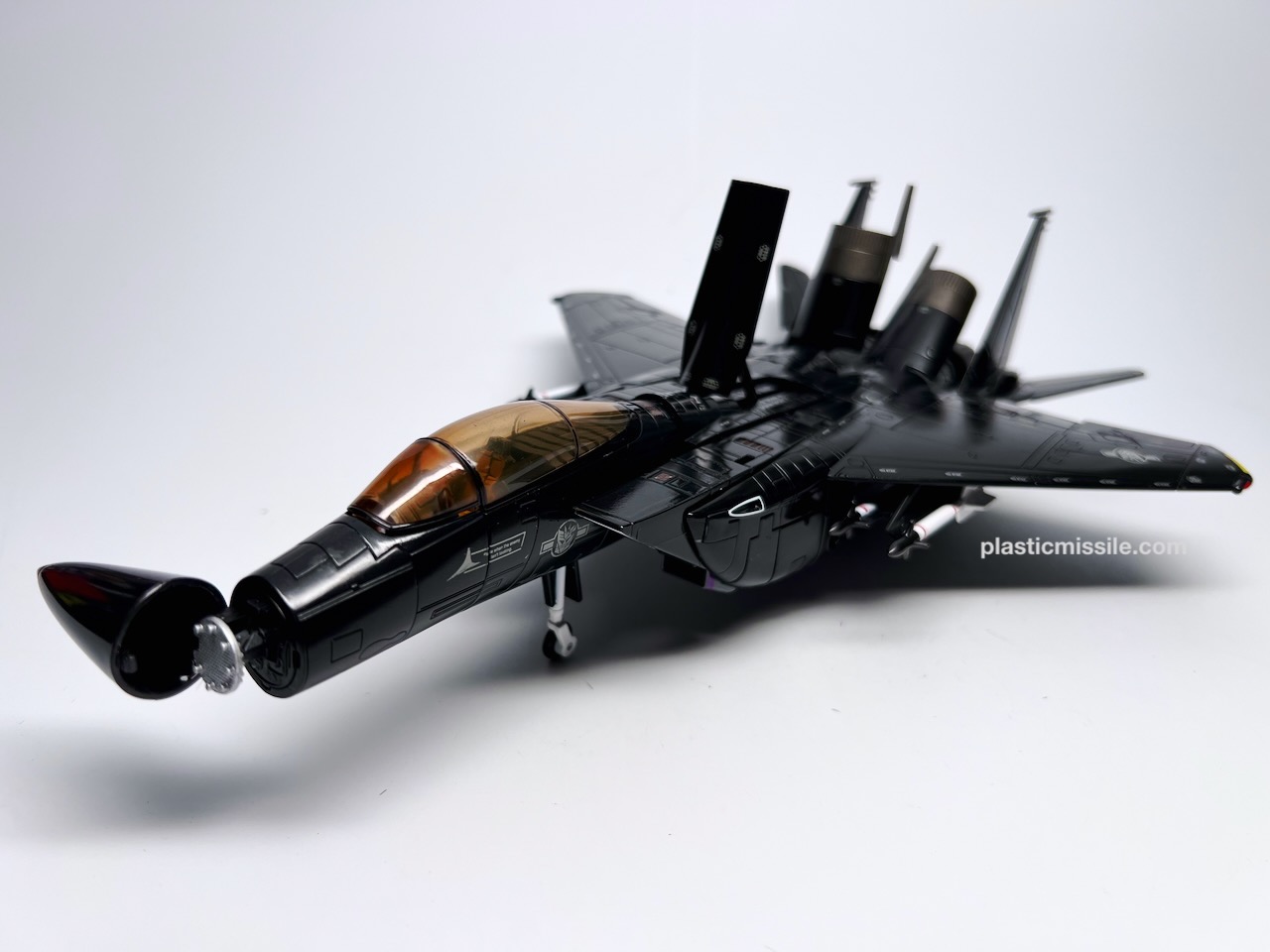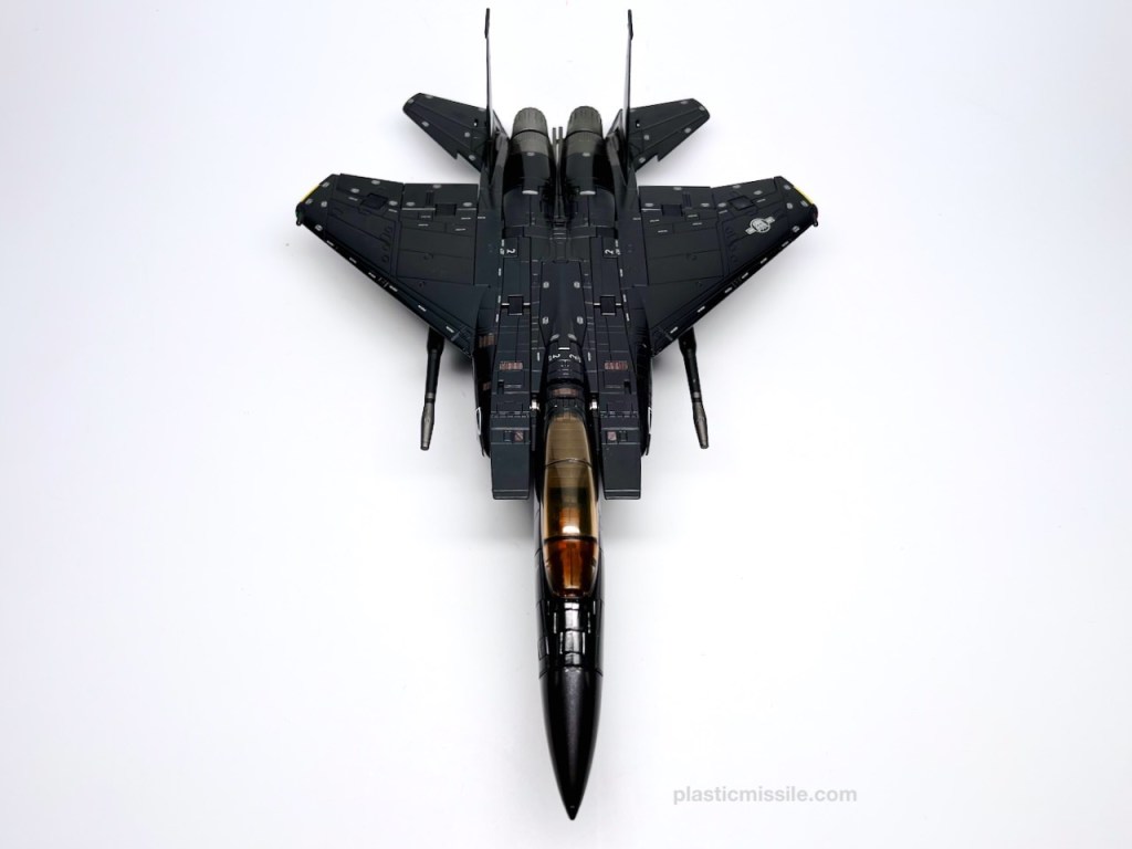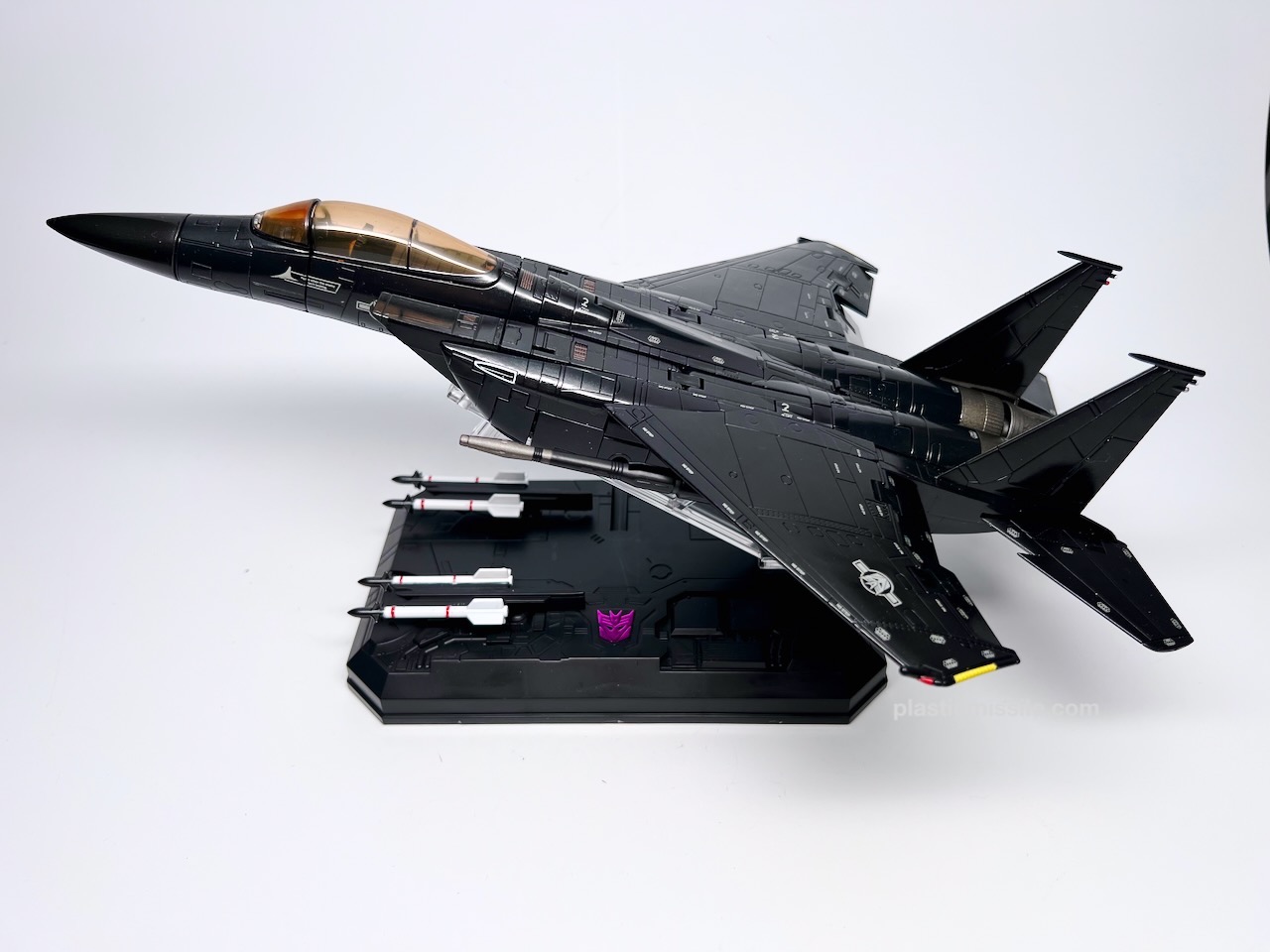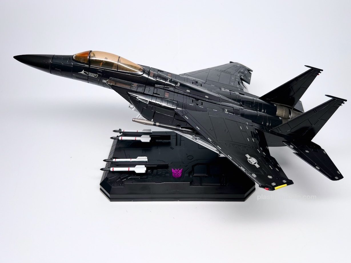 Displayed with its base, the fighter jet could easily be mistaken for a military model kit for the real fighter jet upon which it’s based, the F-15 Strike Eagle. Even down to the sheen and lustre of the high gloss paint. What you get is essentially a very nice model kit that, through some Takara magic, twists and folds into a (somewhat) poseable robot. And what a handsome bot he is! Behold… Skywarp!