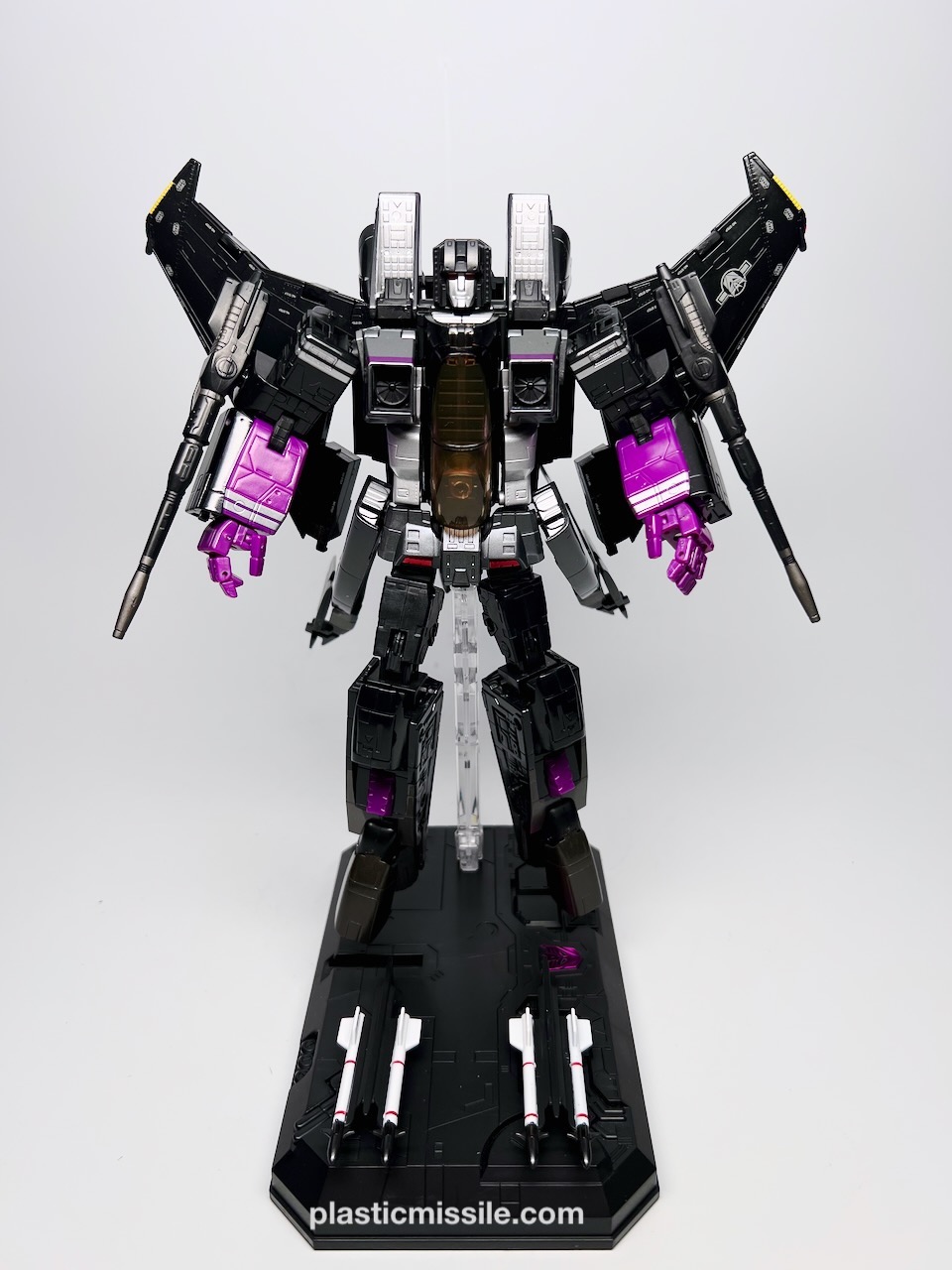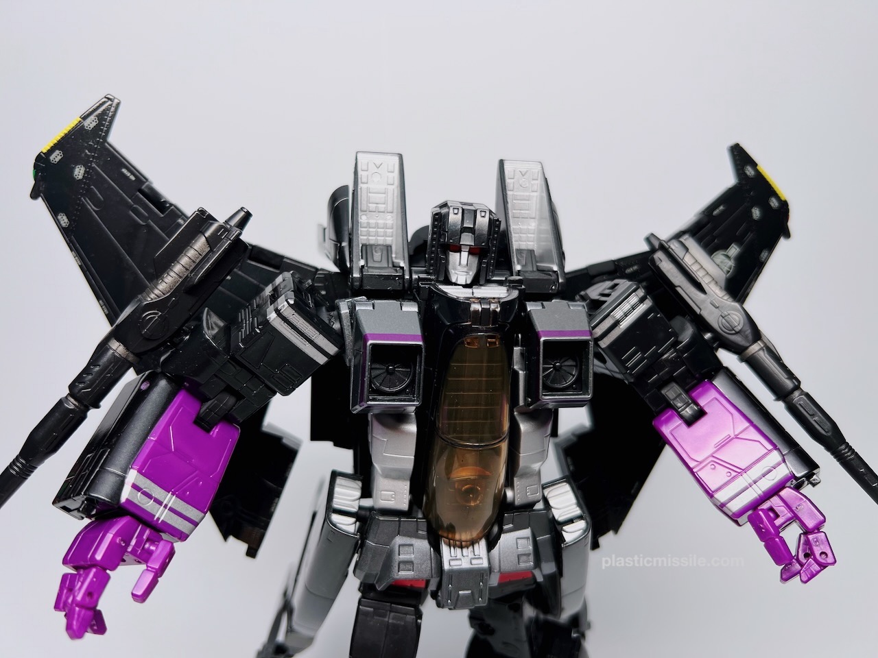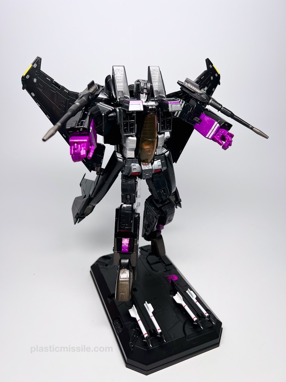Displayed with its base, the fighter jet could easily be mistaken for a military model kit for the real fighter jet upon which it’s based, the F-15 Strike Eagle. Even down to the sheen and lustre of the high gloss paint. What you get is essentially a very nice model kit that, through some Takara magic, twists and folds into a (somewhat) poseable robot. And what a handsome bot he is! Behold… Skywarp!