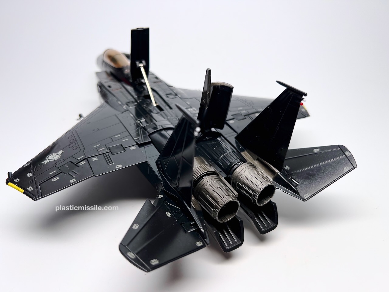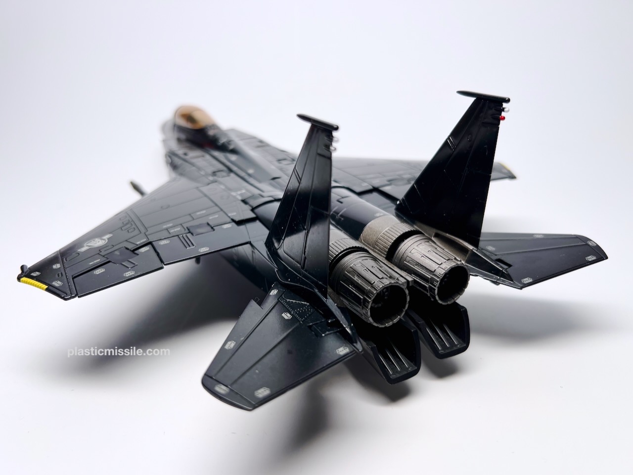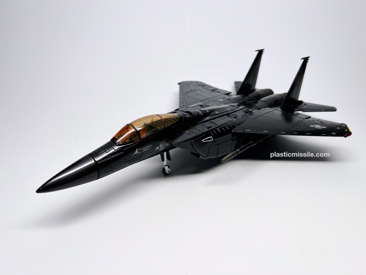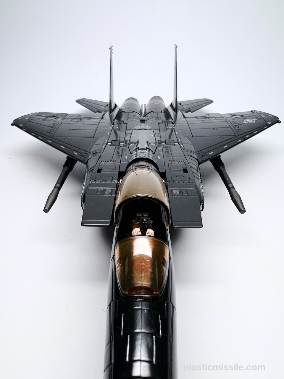 Displayed with its base, the fighter jet could easily be mistaken for a military model kit for the real fighter jet upon which it’s based, the F-15 Strike Eagle. Even down to the sheen and lustre of the high gloss paint. What you get is essentially a very nice model kit that, through some Takara magic, twists and folds into a (somewhat) poseable robot. And what a handsome bot he is! Behold… Skywarp!
