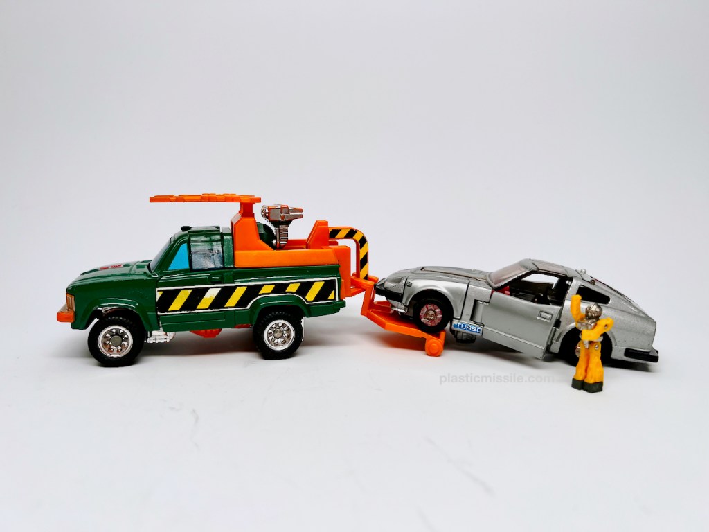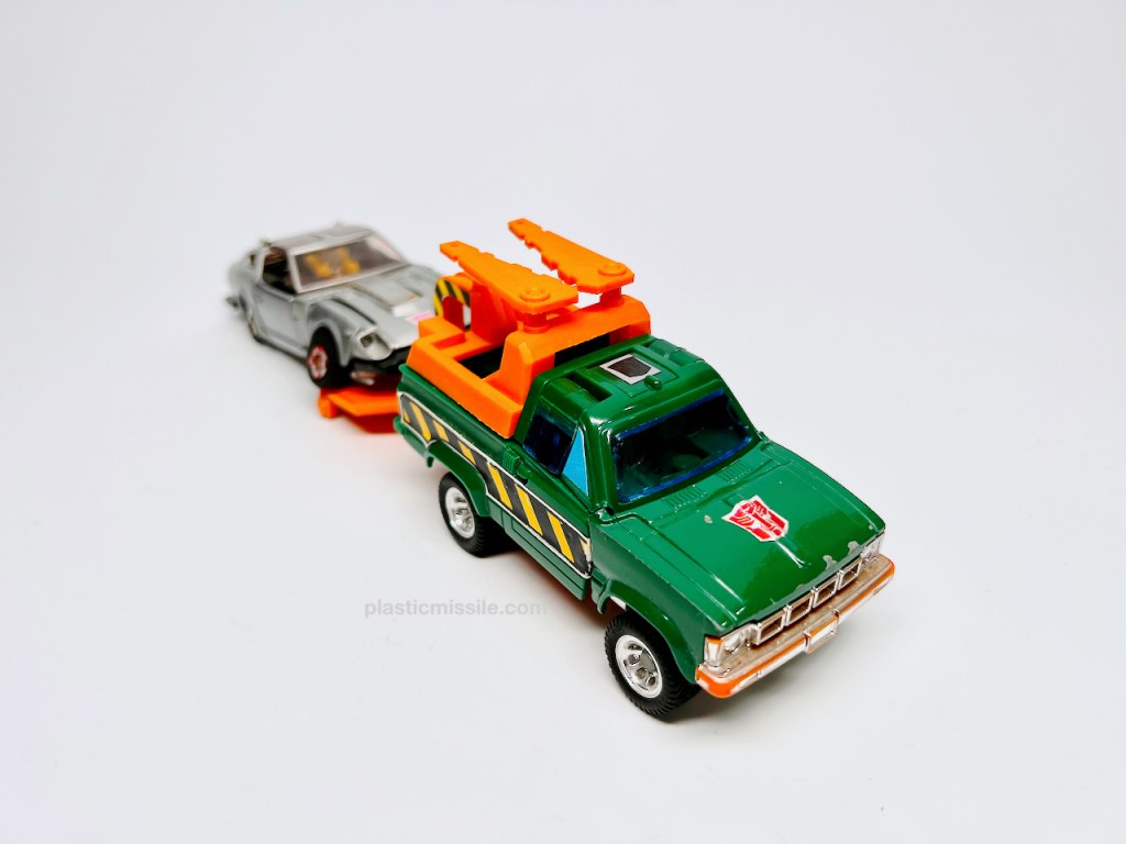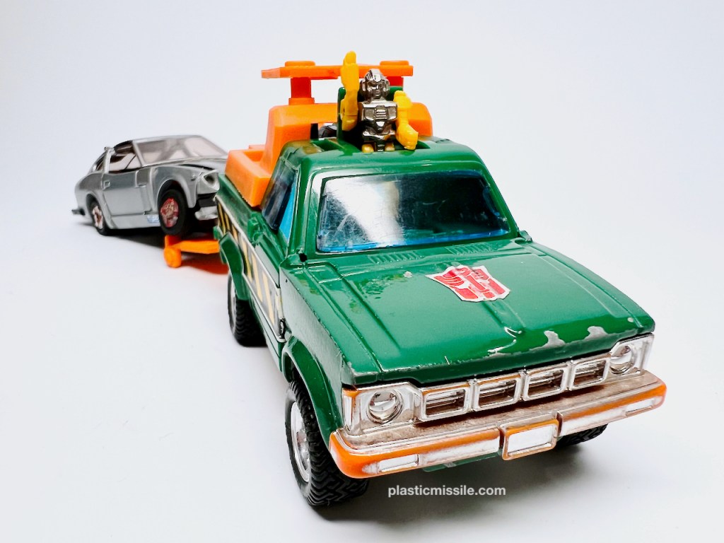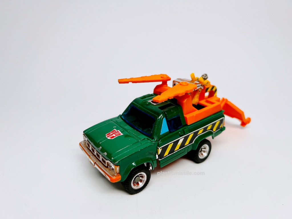 Now, 40+ years later as a dumb adult toy collector, I feel much different about G1 Hoist. Hoist is a superb figure. I’ve grown to love Hoist’s blockiness – half of the figure is literally a block of truck for a torso. All the accessories give you so many options for play and posing in both modes, plus the truck mode can tow other G1 cars, which adds a ton of play value. Trucks are super fun. And the alt mode is not only a tow truck, but a great truck at that – a Toyota Hi-Lux Wrecker Type. Only wish Hasbro had kept the “Wrecker” text on the side of the truck, which they’ve recently done in the Legacy tribute for the red Diaclone variant, Lift Ticket. (I may just have to pickup the MP version. Crap.)