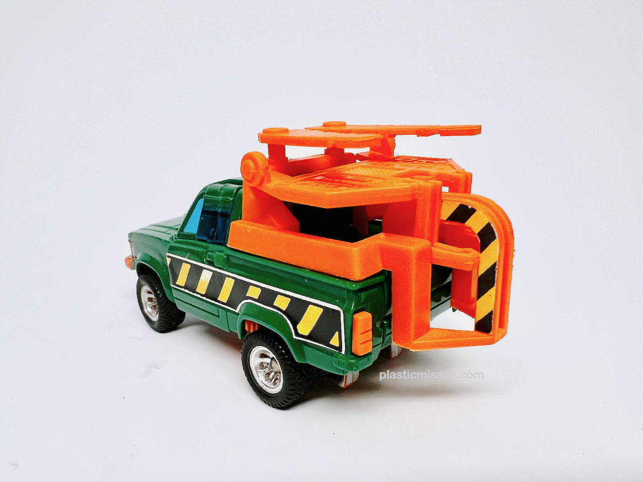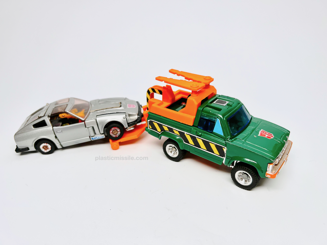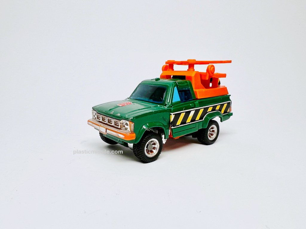 Now, 40+ years later as a dumb adult toy collector, I feel much different about G1 Hoist. Hoist is a superb figure. I’ve grown to love Hoist’s blockiness – half of the figure is literally a block of truck for a torso. All the accessories give you so many options for play and posing in both modes, plus the truck mode can tow other G1 cars, which adds a ton of play value. Trucks are super fun. And the alt mode is not only a tow truck, but a great truck at that – a Toyota Hi-Lux Wrecker Type. Only wish Hasbro had kept the “Wrecker” text on the side of the truck, which they’ve recently done in the Legacy tribute for the red Diaclone variant, Lift Ticket. (I may just have to pickup the MP version. Crap.)