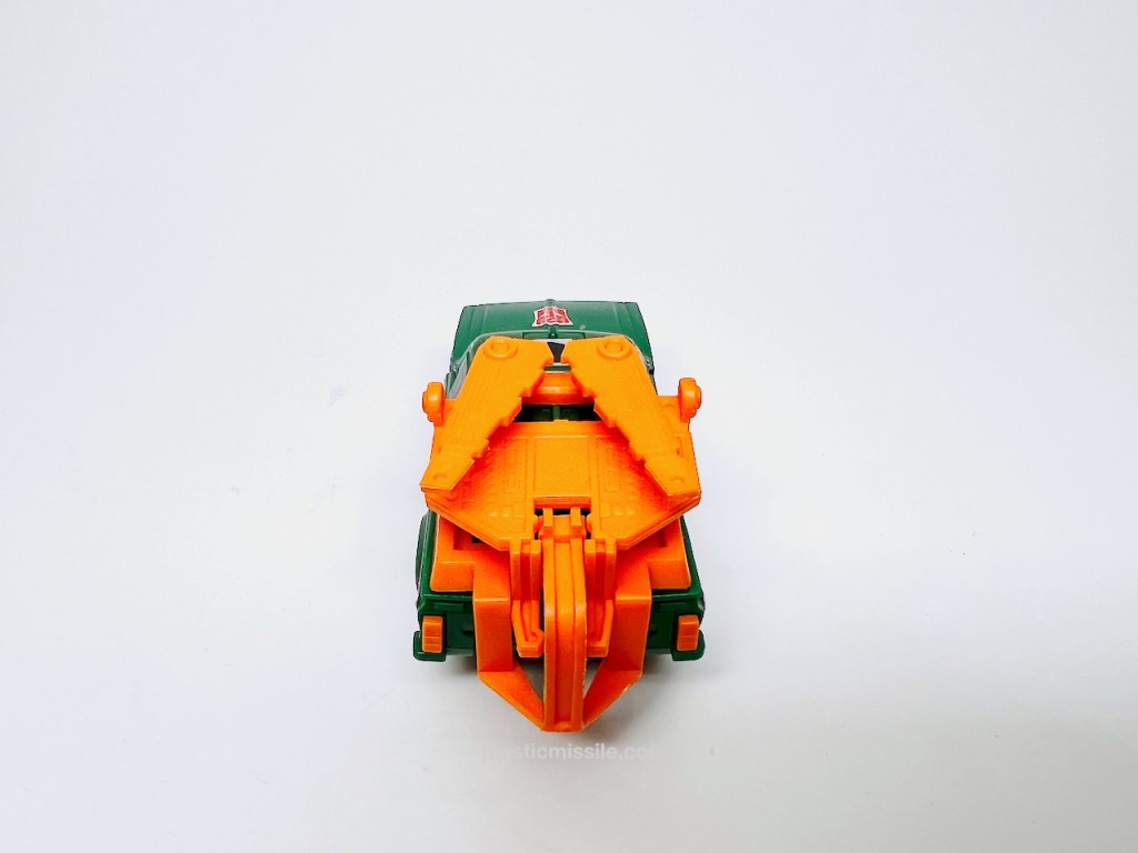 Like our good bud Cliffy, Hoisty is also always there at your side, keeping the team’s engines running and roads clear. A reliable maintenance worker is quite like a federal postal carrier in his dedication to service, come rain or shine, nuts or bolts. And while going about his work he probably gets the job done with a big goofy grin (probably) hidden behind that plain but vented battle mask. I must say, I do love my robots with futuristic ninja masks. Note the peculiar angles, shapes, and details they put onto this funny melonhead: