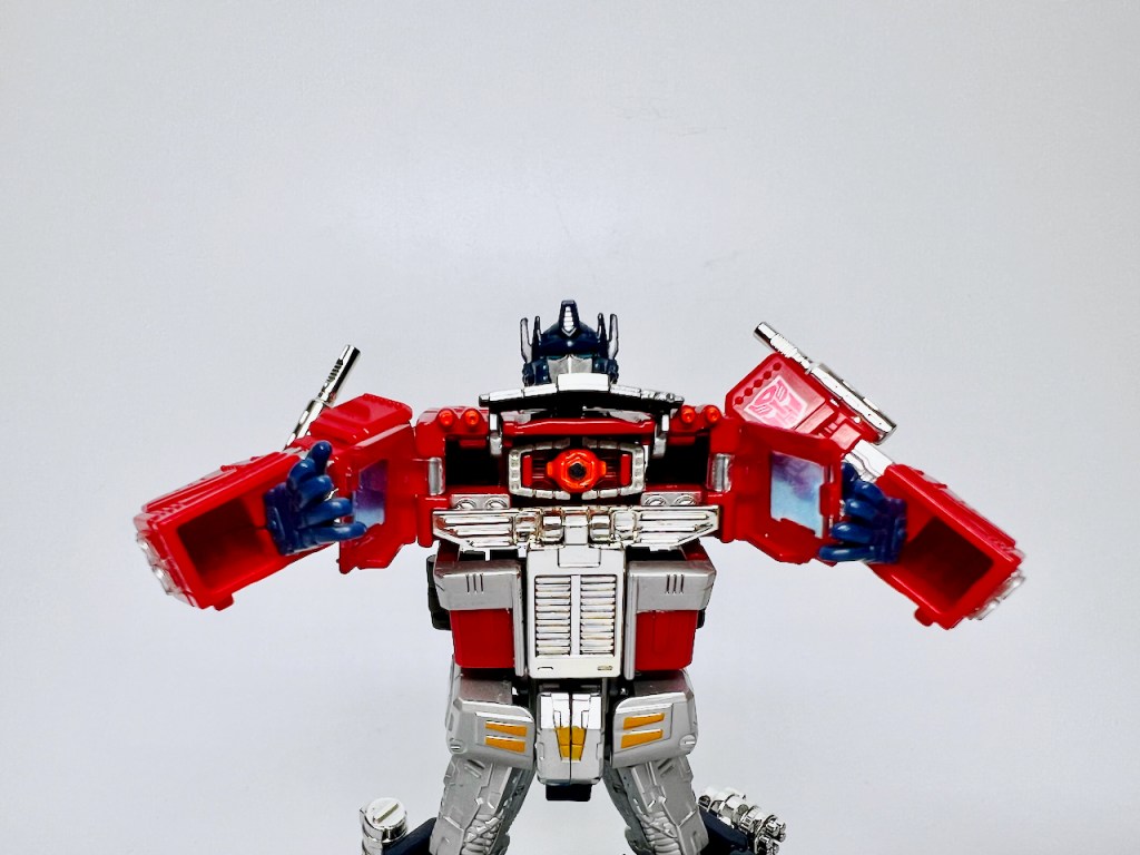 For example, the silver stripes on the side of the truck become his ribs, that still taper in truck mode. The arms look like the familiar arms of a G1 Convoy, but instead of the fists plugging into the headlights as expected, the arms hinge into thicker forearms that look sort of like the cuff of a sleeve on a jacket.