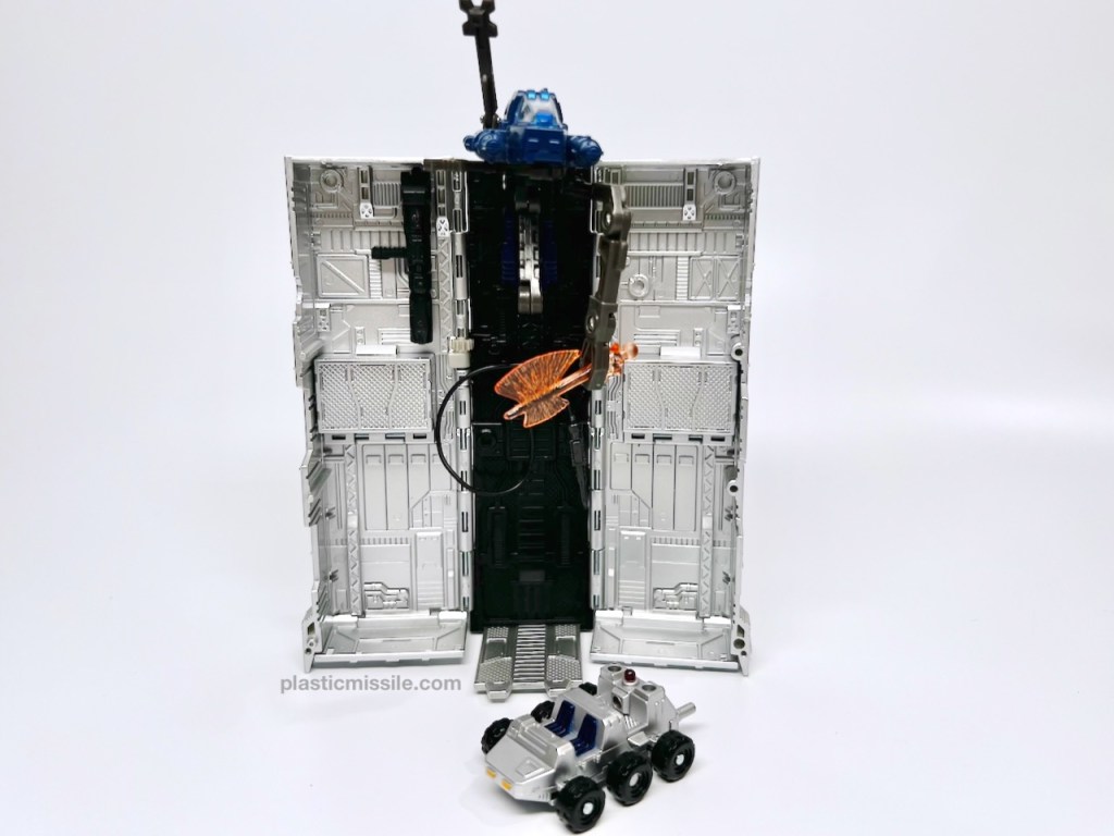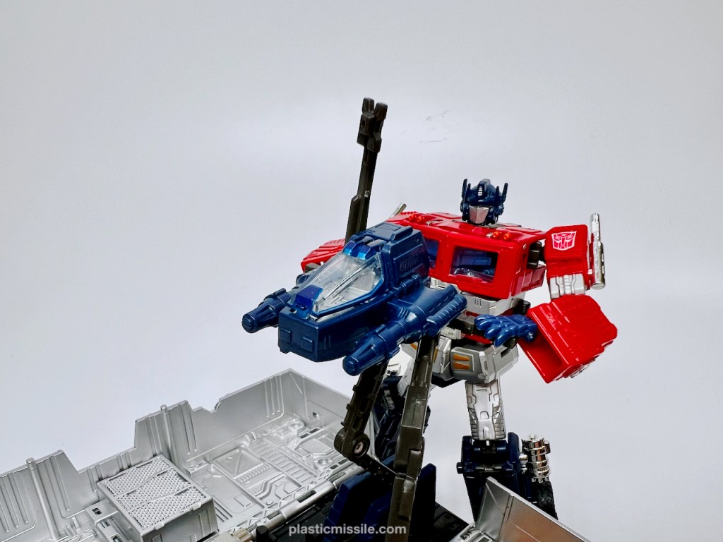 In horizontal mode, the whole trailer becomes kind of an artillery base that Convoy can operate. To me it looks like a futuristic armed sled that Prime / Convoy steers from the back. I especially like this mode and the little handles on the telescoping crane gun that let him hold on and fire. There are no spring-fire missiles on the cockpit, but I don’t miss them very much given all the articulation.