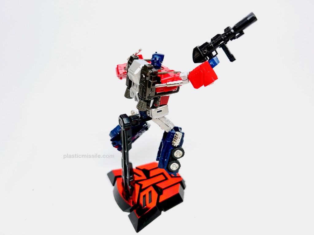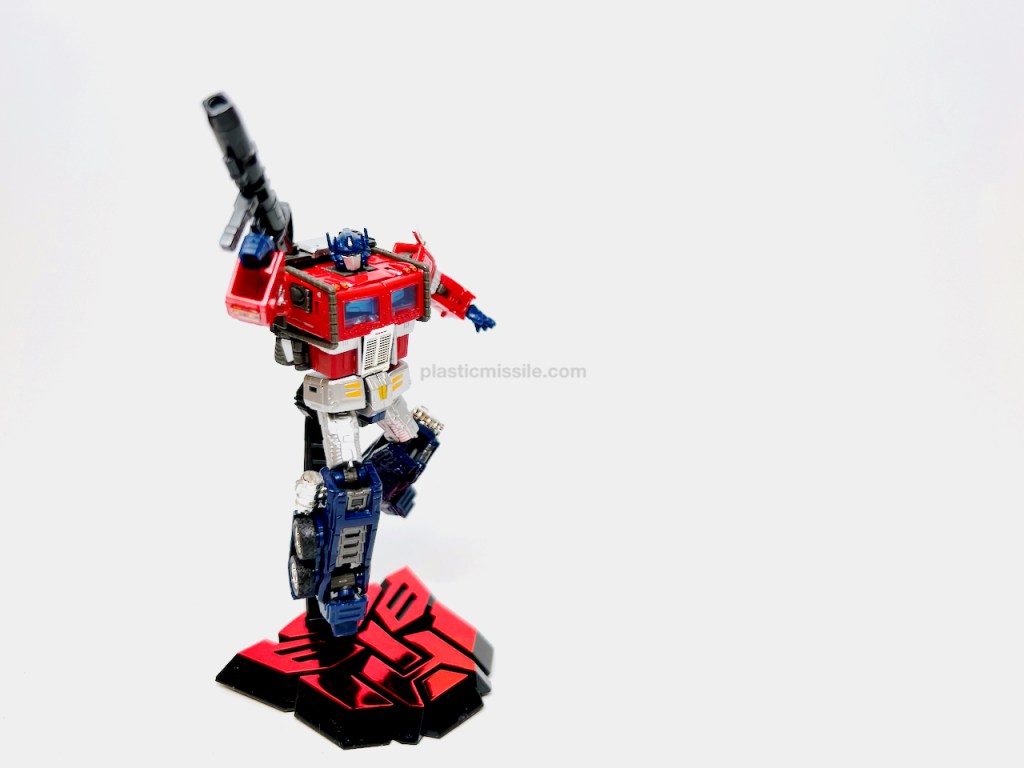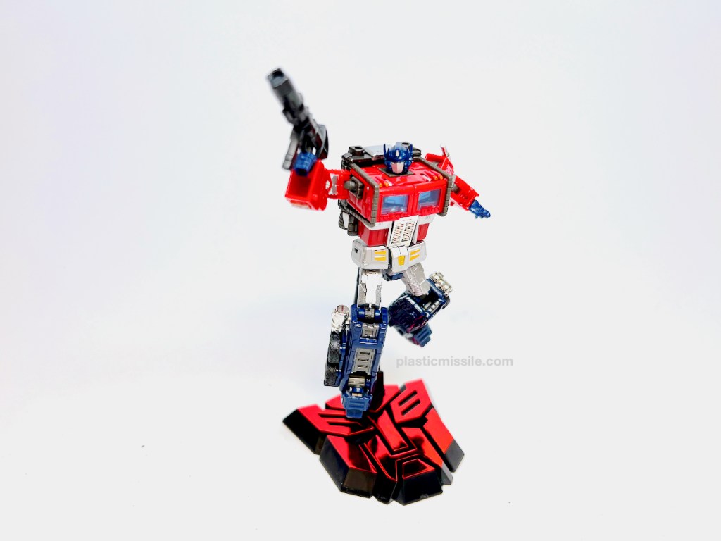 Did I mention I love the add-ons they included? This Autobot insignia functioning as a base for a floating armature? Bonus swag. It’s made of a really nice glossy chromed plastic that looks good enough to display on its own.