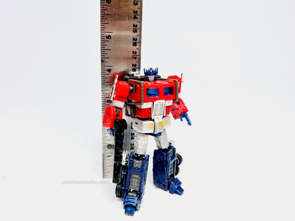 I’ve never been a big fan of non-transforming Transformers. I’m not into statues, licensed merch like Funk POP, and even back in the day I had issues with the rubber eraser-material decoys that were free giveaways, mostly because they didn’t get the likenesses quite right, or weren’t perfectly formed angles; they were lumps. I’ve got the R.E.D. Megatron, which sits on my work desk as a fidget toy, but simply put – all Transformers should transform. That said, while the Hybrid Style G1 Convoy does transform, this guy is something of a cross between a super poseable action mini-figure and a transforming robot. For reference, this figure only stands at around 4″ tall, making it bigger than core class but much smaller than other figures to date. The legs and chest windows are die-cast, giving this diminutive Autobot leader some nice heft.