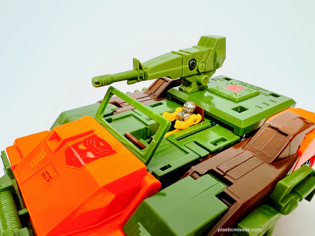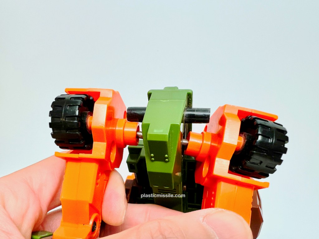 Here’s a Diaclone driver for scale reference. The cockpit is super long and narrow so that no driver could really look right in the driver’s seat, but it’s still looks super cool. It also shows you how massively wide this jeep would be.