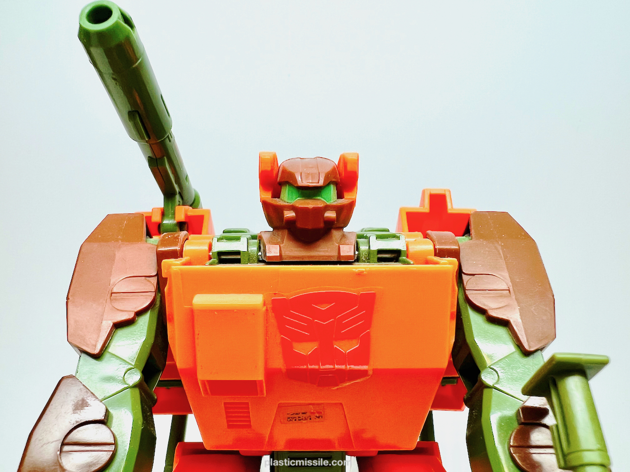 The details are well sculpted and pretty intricate at this price level, and there’s quite a bit of heft from the die cast legs, although they are painted brown over metal, lending to a lot of corner wear. Also, the legs are pulled out of the die cast shis, but are super stiff and prone to getting stuck as it relies mostly on friction to stay in place, with die cast rubbing on plastic. Plus he’s got fake knee joints molded into the plastic, so he looks like he would have a knee bend, but alas – no, this is essentially a stick figure with only a shoulder pivot. Fortunately, he makes up for it in firepower.