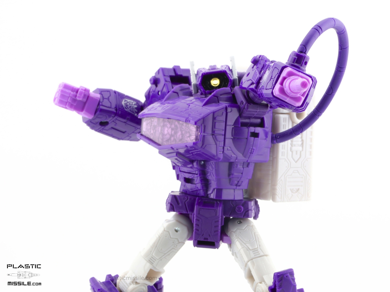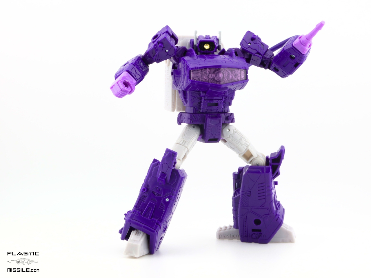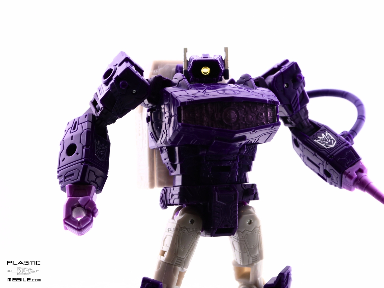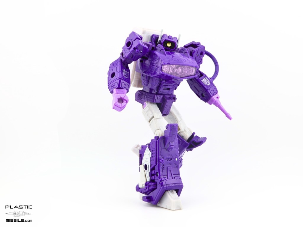 The original reason I got the Dramatic Capture 3-pack was for the silver paint apps on Soundwave. To be honest, I’m not even interested in taking out Megatron out of package because I’m not a fan of the design at all. But after having played with this figure and Soundwave for a few weeks now, I think this Shockwave is really the star of the show – at least a close tie. The articulation, the sculpt, the proportions, and most of all – gorgeous colors! I’m usually (almost always) toy-accurate over cartoon-accurate, but in this case we see a balance struck somewhere in the middle. It’s not lavender like MP-29, deep indigo purple like the original G1 (which I posted an even deeper purple KO here) or toy-accurate MP-29+, or a navy blue purple like its original mould mate, WFC Siege Shockwave. No, it’s another purple. It’s violet purple. VIOLENT purple, perhaps, as it’s Shocky?