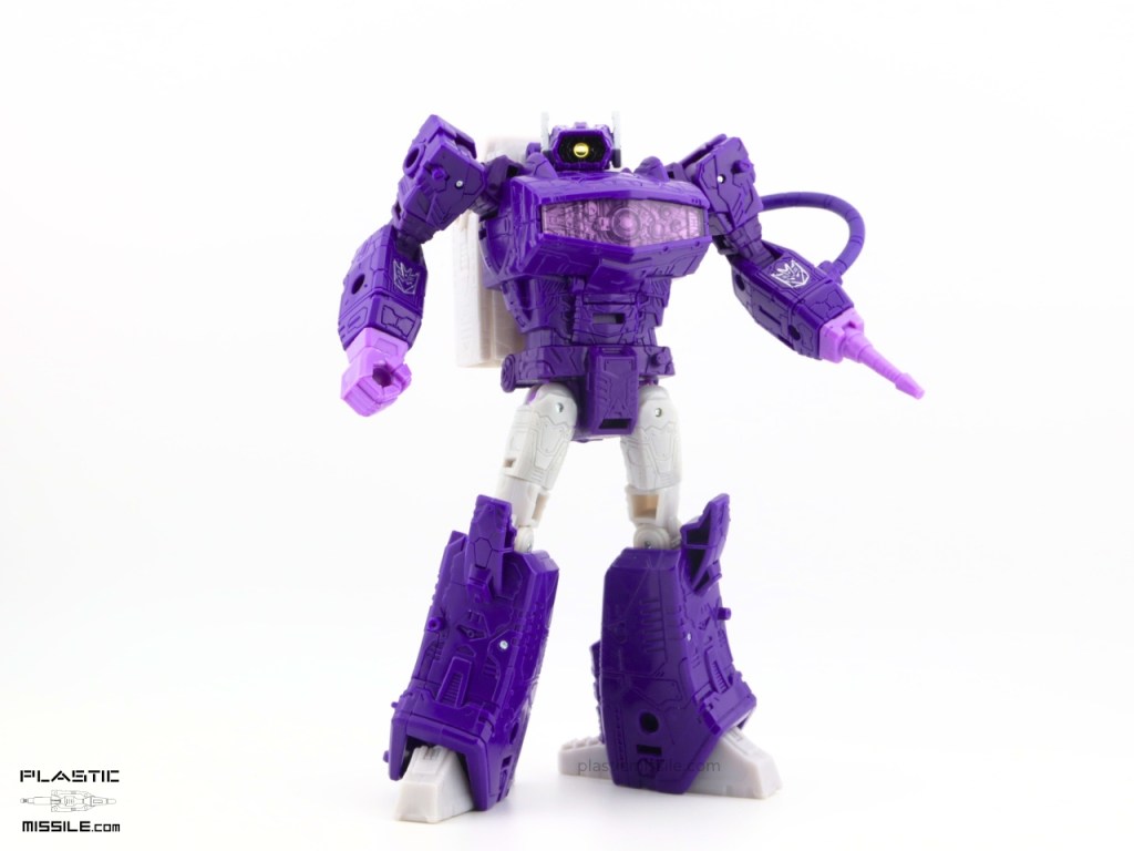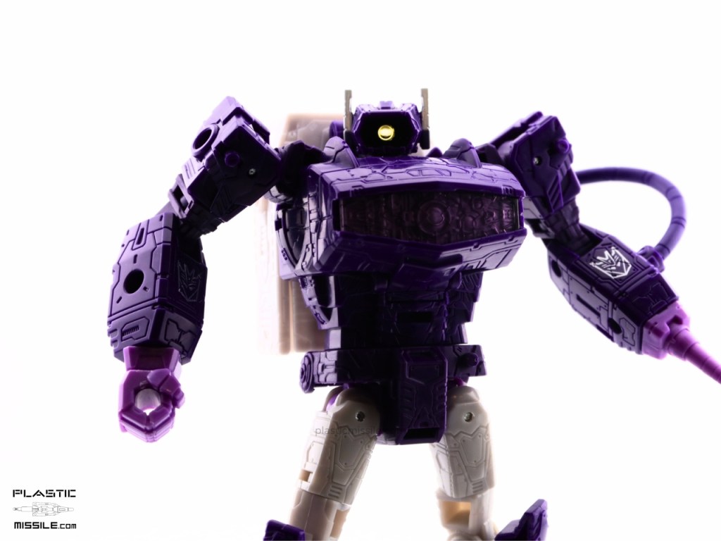 Shockwave looks best to me in his cartoon deco, and they’ve matched it artfully with the NB release. I won’t say flawlessly, as it would be nice to have his black hose and darker gray on the legs and feet. Plus a purple backpack would make sense as well. But not nitpicking. Really. I think they’ve done a great job, and I really don’t have any big gripes with this guy at all… in robot form.