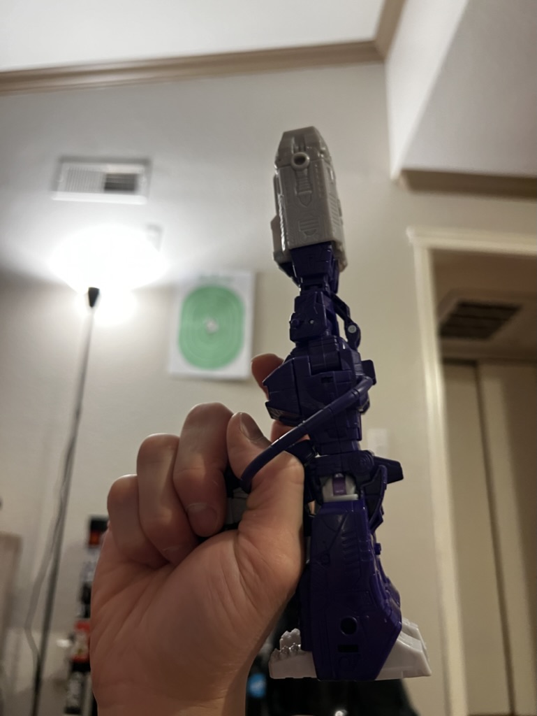 Was it intentional? Fan service? Is it even a good gun mode? Who cares? The G1 gun isn’t really all that “realistic” anyway, as it’s a space gun, and as long as he’s got the barrel and some kind of handle looking parts, it qualifies as Shockwave’s gun mode to me. There are aftermarket upgrade kits to this release that give it actual handles, such that it will sit upright easily on its own and also fit into the hand – of a child. Sort of. This is decent enough for my needs. I just need to be able to kind of hold it, or look like I’m holding it. And I can make my own “pew pew” sounds.